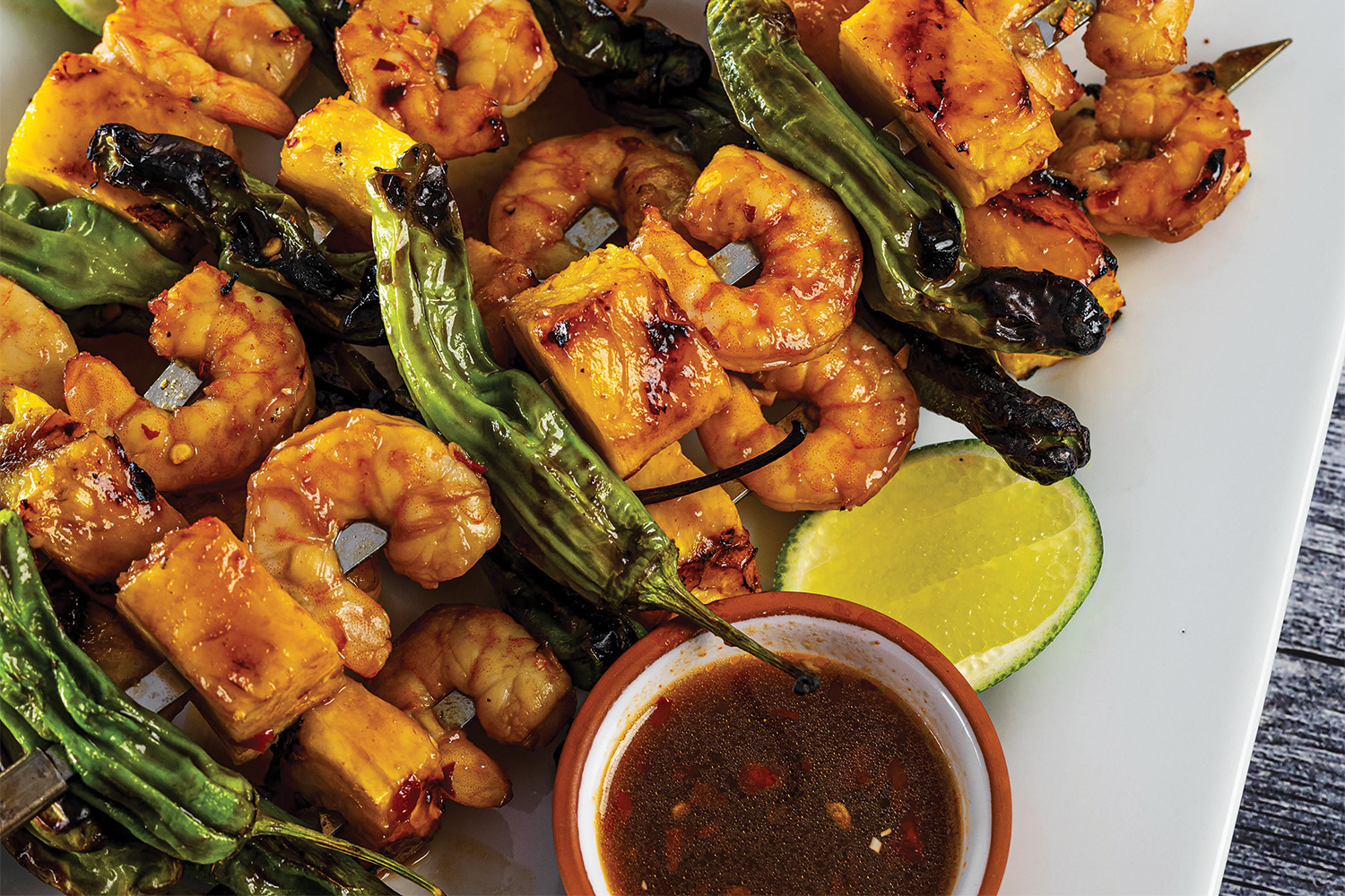 Huli Huli Shrimp, Shishito, and Pineapple Skewers